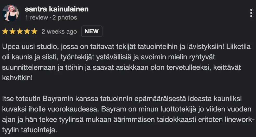 Käytössämme on alan uusinta teknologiaa ja mukavat tilat. Keskitymme täysin sinuun ja tatuointiisi, jotta saat parhaan mahdollisen kokemuksen.